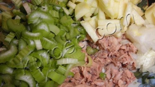 Салат с тунцом, яблоком и сельдереем получается по-весеннему свежим и сочным.
