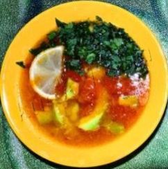 Перед подачей положить в суп нарезанные дольками авокадо и курицу, украсить кинзой или петрушкой и дольками лимона.