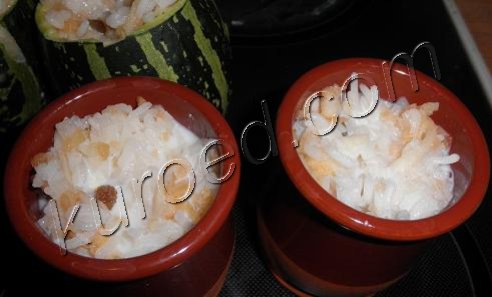 Получившейся кашей заполнить тыкву и накрыть шляпкой.