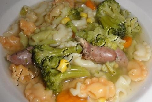 Густой куриный суп с сердечками, разноцветными макароннами и брокколи: