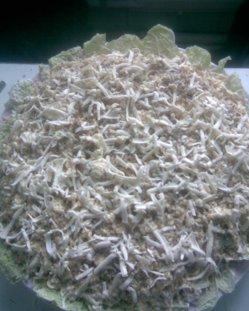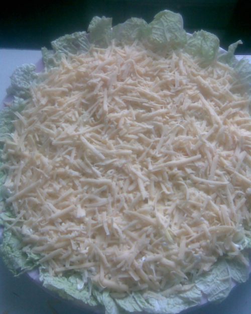 3-й слой - сыр плавленный - натереть на крупной терке + сеточка майонеза,