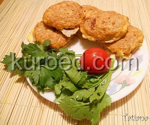 5. Нанести фарш на вафлю, накрыть сверху второй "вафелькой", аккуратно обмакнуть наши отбивные в кляр и обжарить их на среднем огне.