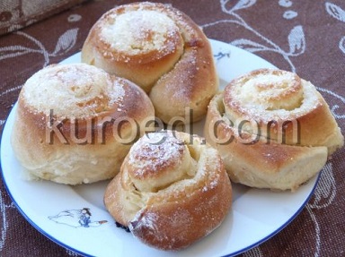 Перед выпечкой булочки посыпать сахаром (на каждую - по 0.5 чайной ложки).