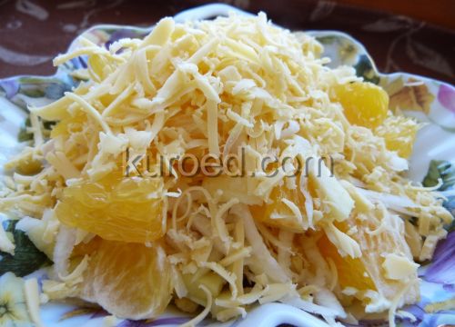 Салат с курицей, сельдереем, яблоками, сыром и апельсинами.