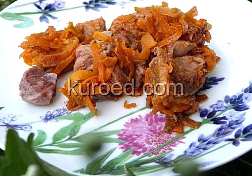 3. Овощи добавить к мясу (уложить поверх него), по желанию добавить вымытый лавровый лист и несколько горошин перца.