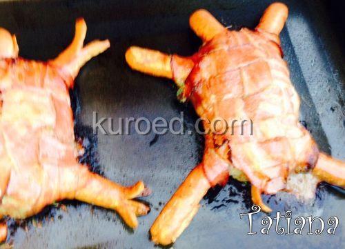 Каждую котлету обмотать беконом ("шахматкой") и закрепить зубочисткой - это будет туловище в "панцире" для нашей черепахи.