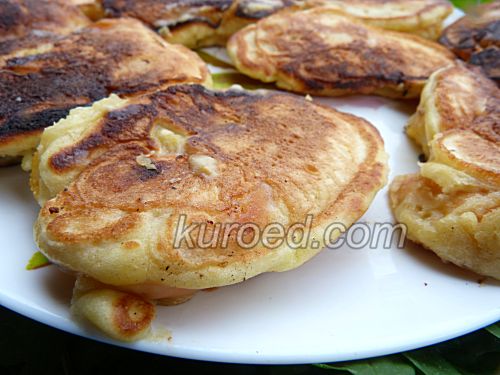 Кусочки фруктов крупные, поэтому оладьи выходят очень пышными, похожими на быстрые жареные пирожки с персиковой начинкой.