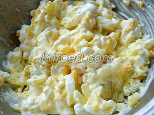 4. Остывшие яйца очистить от скорлупы, нарезать кубиками